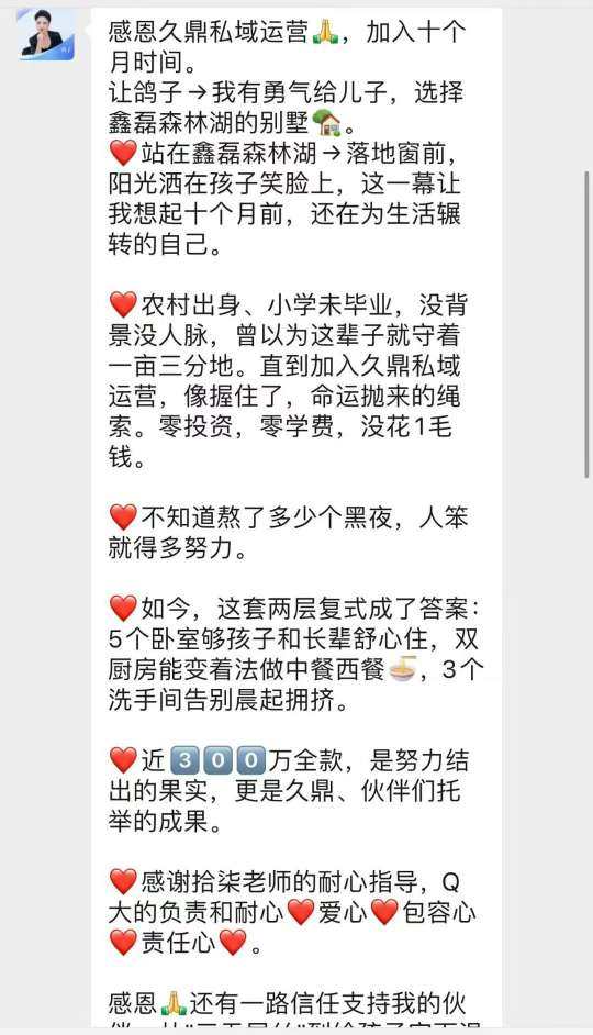 鸽子农村小学未毕业,遇到久鼎就像抓住救命稻草一样,在一分钱不投下 ,短短几个月成功逆袭,成功上岸,0投资赚大钱,直接拿300万全款买了别墅区复式楼💰[强][强]