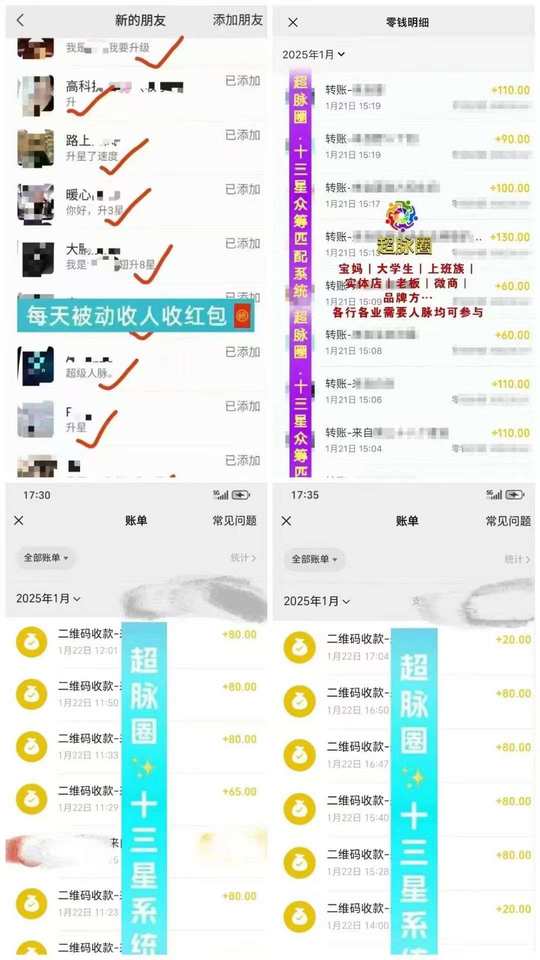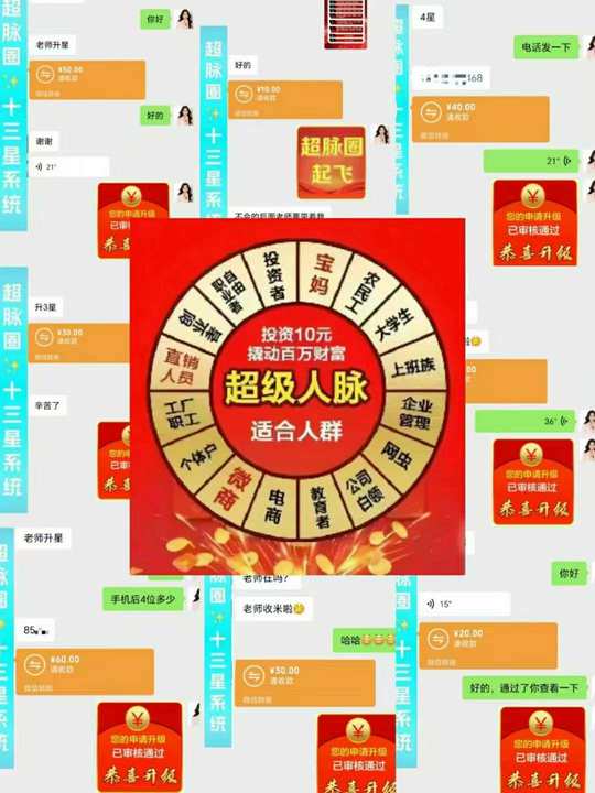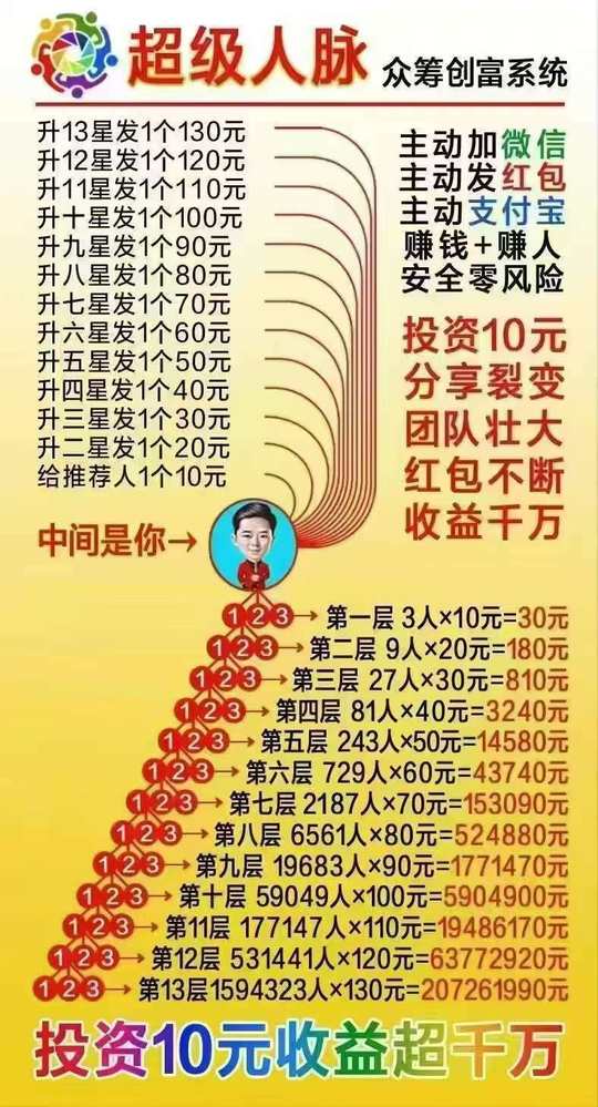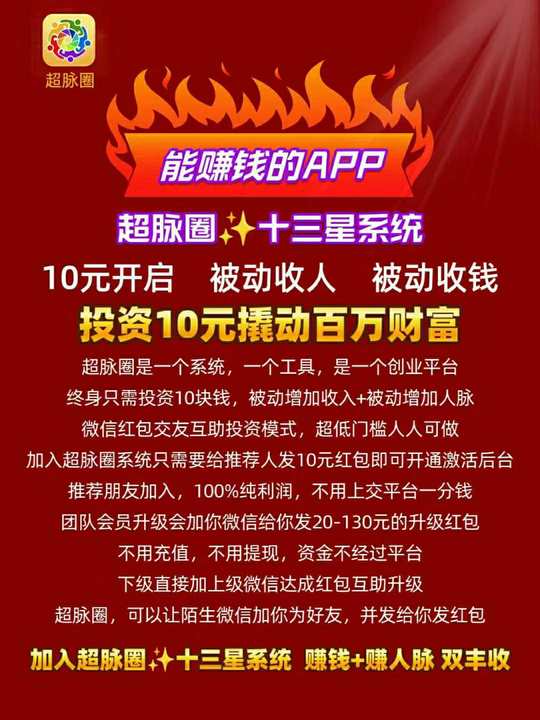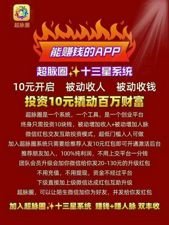 形象点说,超脉圈就好像是一个收费站,只需要投入10红包即可开通一星收费站,开通一星收费站就可以赚取很多个十元红包,每个人只有十三星级收费站,收费站级别越高,收的红包,越大,越多。