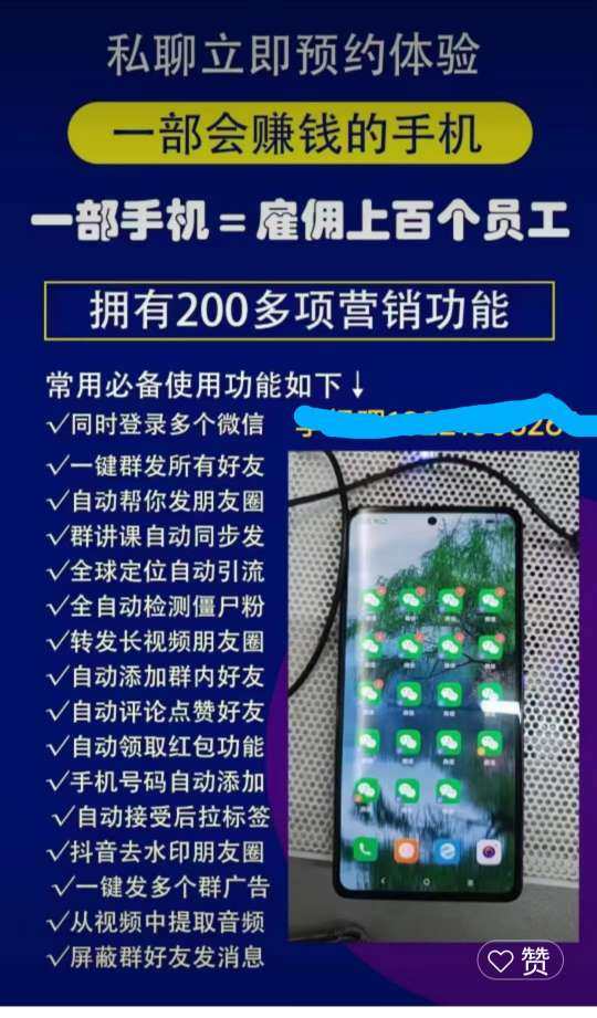 多功能自动化营销手机,可以同时运行6~16个微信,设置好后,可自动打招呼、自动回复加好友、自动进群自动抱红包🧧、一键群发一万人、多个微信号跟着主号转发朋友圈、转播课程…