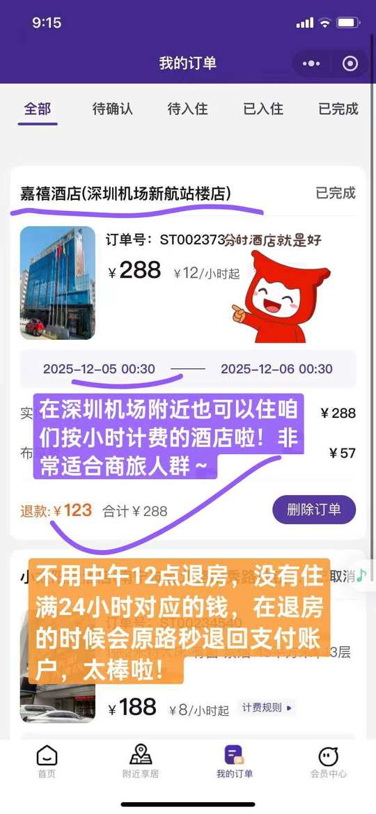 不用中午12点退房,1小时即可起订。