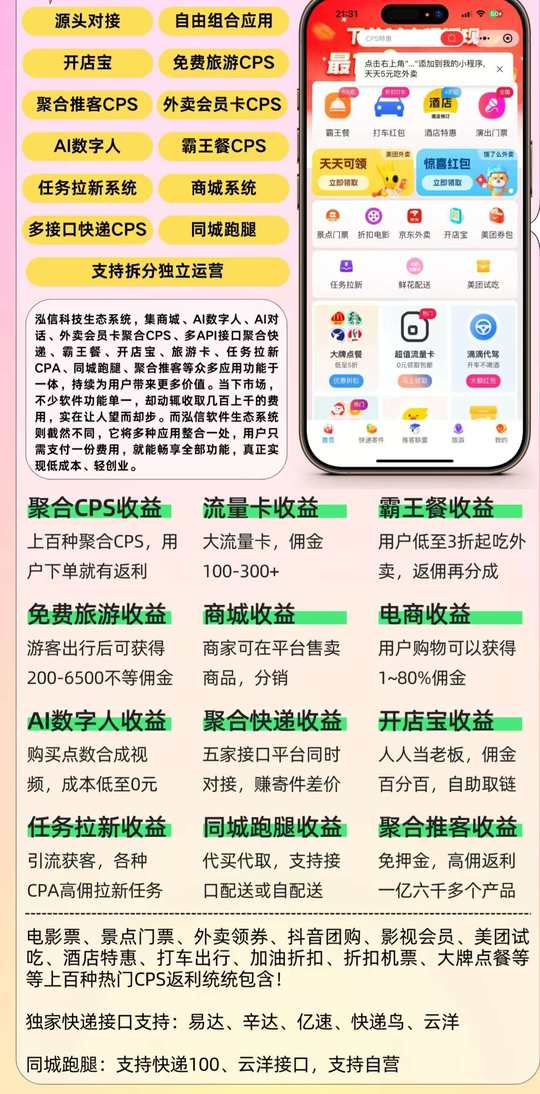 泓信天下cps聚合生态系统全链路聚合 一站式服务13个经典项目:CPS联盟 霸王餐 链动商城 wifi贴 任务活动 免费旅游 开店宝 聚合快递 聚合推客 聚合同城 流量卡 书友会 大健康