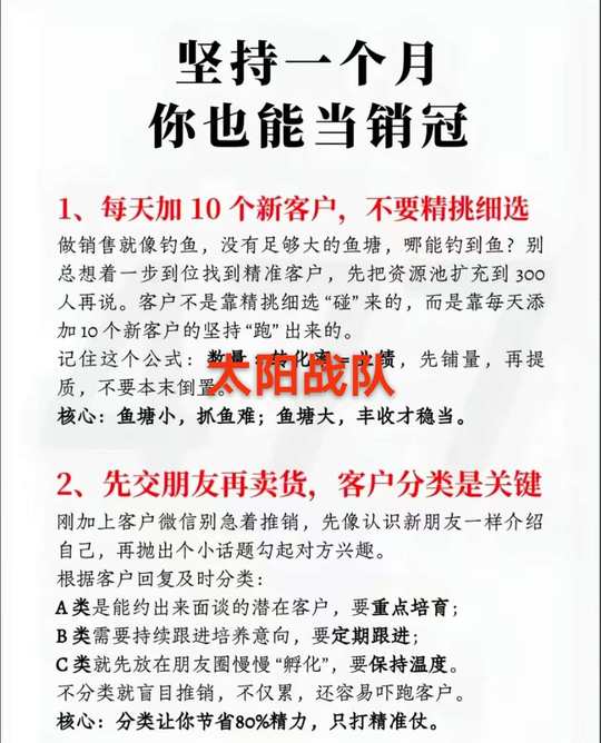 做销售就像钓鱼🎣,没有足够大的鱼塘,哪能钓到鱼?别总想着一步到位找到精准客户,先把资源池扩充到300人再说。客户不是靠精挑细选“碰”来的,而是靠每天添加10个新客户的坚持“跑”出来的。